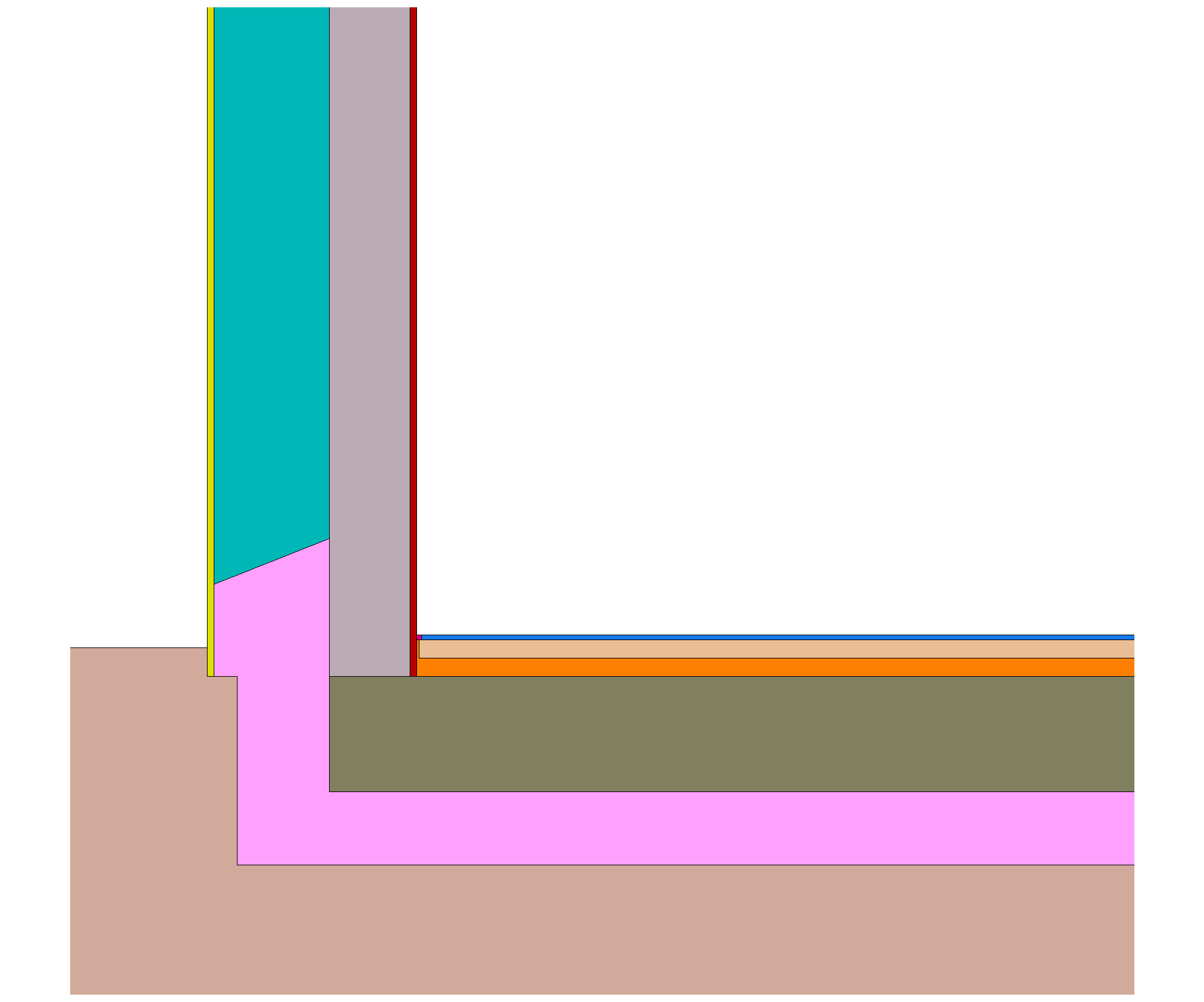 The floor slab insulation system consists of a 16 cm thick XPS insulation, 0.038 W / (mK), to ground and 20 cm to the side as flank insulation as a lost formwork. The thickness of the floor plate is 25 cm, followed by a 4 cm sound insulation, 4 cm screed and 1 cm flooring.