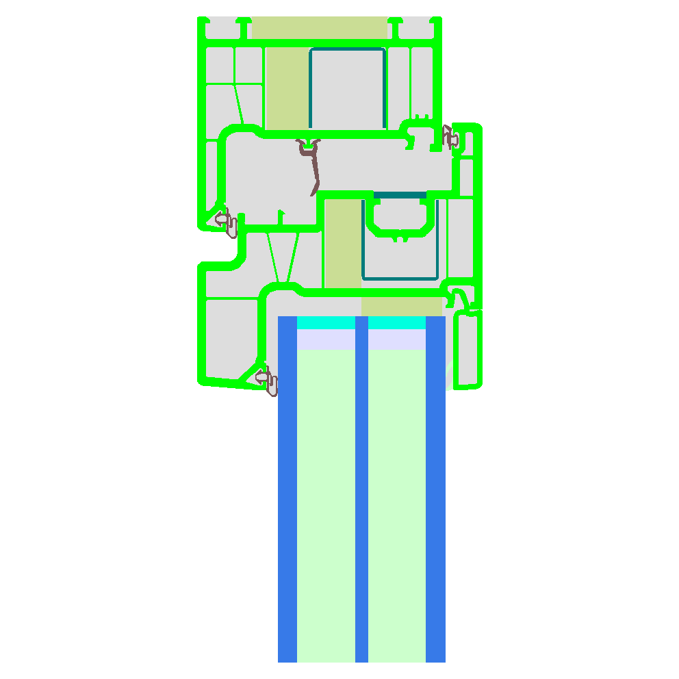PVC window frame with steel reinforcement and insulation inserts in both the frame and sash (XPS insulation; lambda = 0.036 W/(m.K)). The maximum tested area of the sash is 2.50 m². The maximum tested dimensions of the sash are 0.80 x 2.20 m, 1.50 x 1.50 m, or 1.25 x 2.00 m. Pane thickness: 52 mm (6/18/4/18/6), rebate depth: 23 mm. Spacer: SWISSPACER Ultimate with butyl as secondary seal.