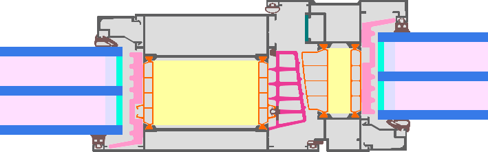 Thermally separated aluminium frame with polyamide separators (Technoform Low Lambda PA 66 GF 25) and phenolic foam insulation (Kingspan Kooltherm, 0,022 W/(mK)). Pane thickness 54 mm (6/18/6/18/6), rebate depth 18 mm, spacer: TGI Precision with butyl secondary seal.