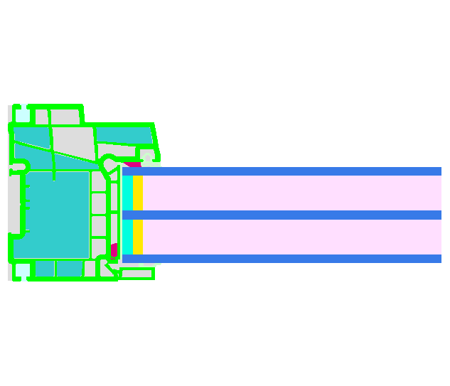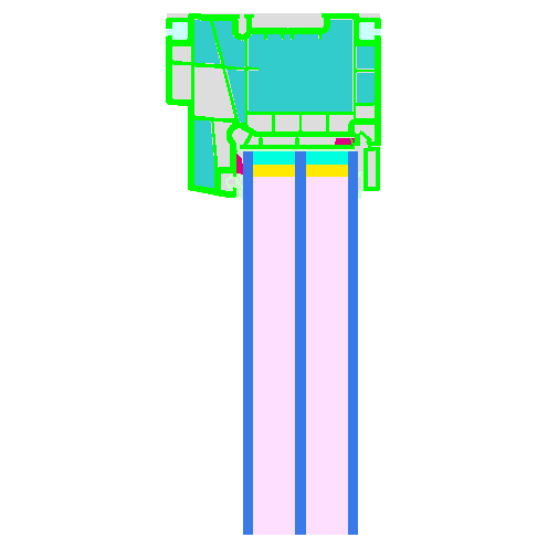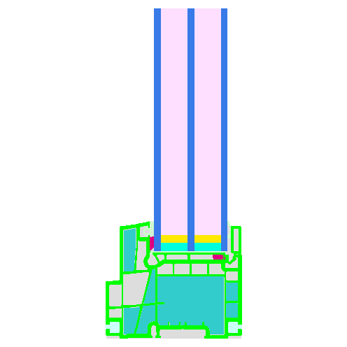 Non-reinforced PVC frame, insulated with EPS (0,031 W/(mK)). The maximum window size with this reinforcement is 48" (1,22 m) wide by 72" (1,83 m) high. There is no restriction regarding colour finishes. Pane thickness: 44 mm (4/16/4/16/4), rebate depth: 18 mm.
