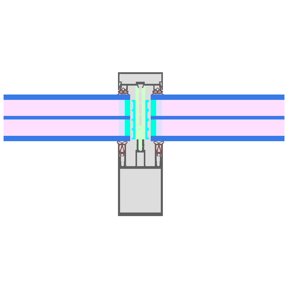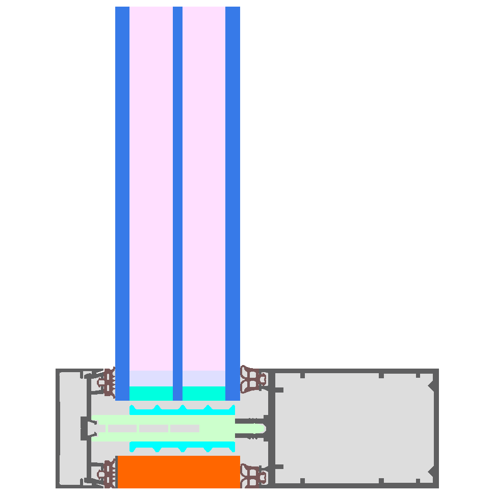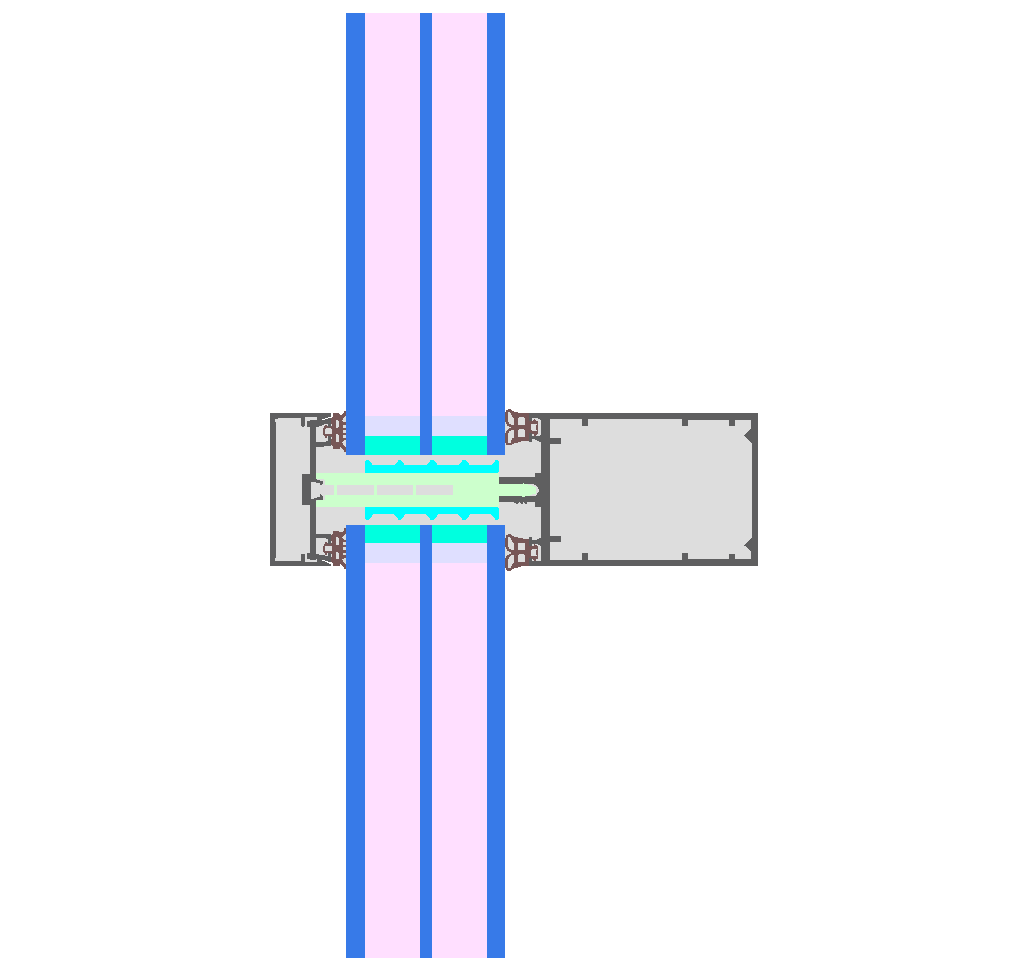 Curtain wall facade with insulation inlay of XPET (0.029 W/(mK) and polyethylene foam (0.038 W/(mK). Thermal bridge values of glass support and fastener determined via measurement (ift). Butyl secondary sealing. Pane thickness: 52 mm (6/18/4/18/6), rebate depth: 13,5 mm.