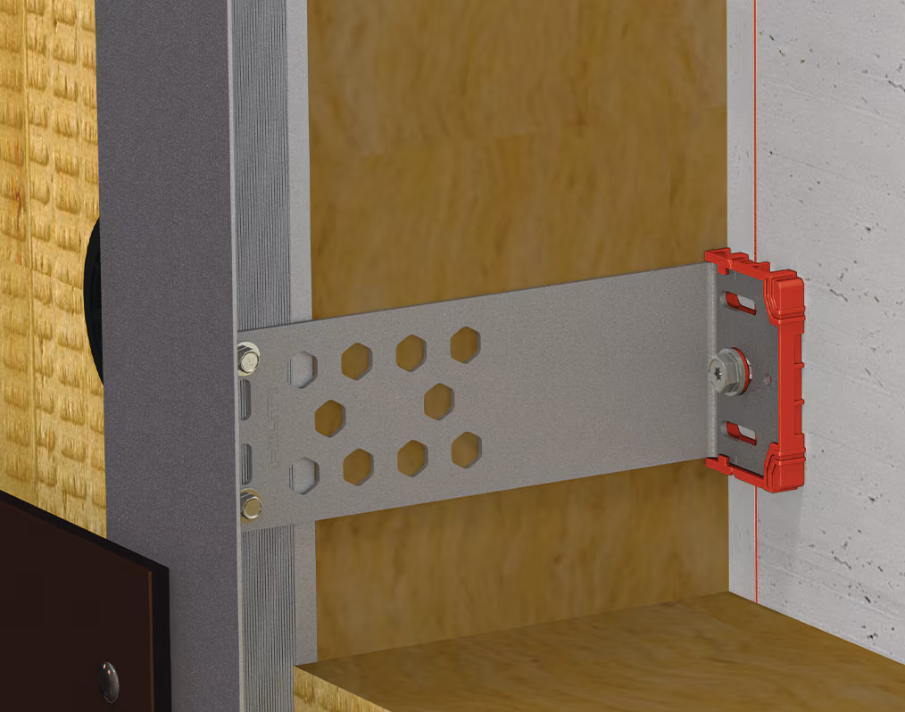 Stainless steel bracket with pre-assembled isolator for the fastening of ventilated facades requiring high thermal efficiency and fire compliance. The corrosion-resistant stainless-steel bracket made from duplex steel with pre-assembled isolator offers great flexibility and optimization possibilities in the technical design. The extended range of bracket-sizes (small, medium and large) and bracket-lengths (60 to 300 mm - in 20 mm increments) enables greater planning efficiency and reduces material use and costs. The pre-assembled isolator (thermal isolator) reduces the installation time, while the optimized “helping hand” clip holds profiles in place to ensure correct installation. The bracket’s base plate has 6.5 mm and 11 mm holes for fastening with anchors, screws and direct fastening (DX) on primary building structures made from concrete, masonry, steel and wood substrates. The profile connection via round holes for fix-points or elongated holes for the sliding point formation (constraint-free substructure) enables the installation of façade substructures for common façade cladding types. The brackets allow adjustability of the vertical profiles for single- and double-layer systems up to 40mm and grant the installation of a wide range of façade elements. Certified and tested: EN 1090 (CE marking), fire protection class A. Suitable as standard for rear-ventilated facades in corrosive environments (C3).