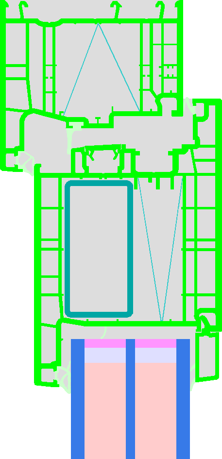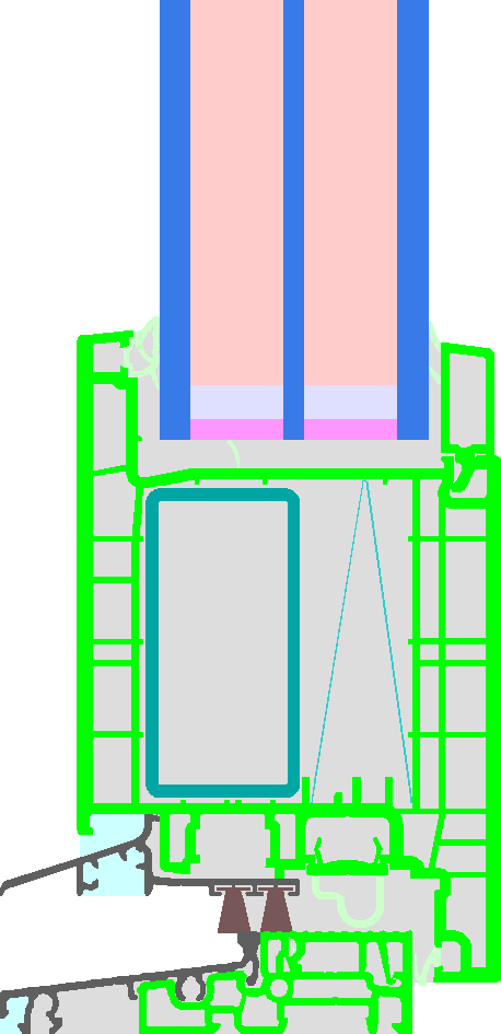 PVC frame with low emissivity bars (e = 5 %) for improving the thermal resistance; Steel reinforcement in the sash and at the lock side also in the blind frame; Maximum Sash dimensions with the chosen reinforcement: 1.05 m * 2.30 m. Pane thickness: 52 mm (6/18/4/18/6), Ug-value 0.54 W/(m²K), rebate depth: 21 mm. Spacer: MULTITECH G with polysulfide as secondary seal