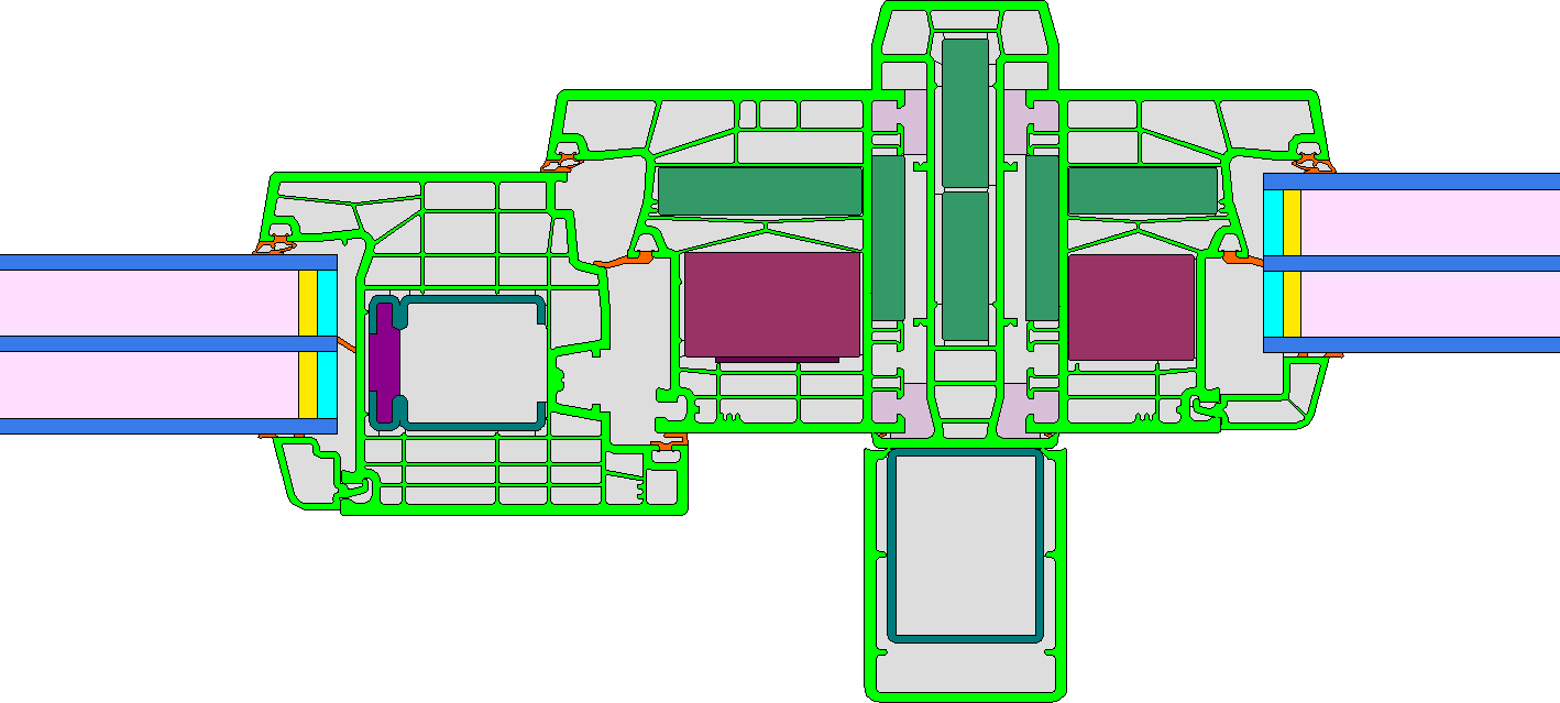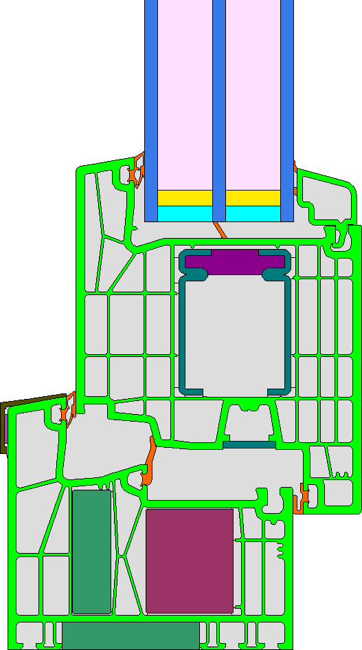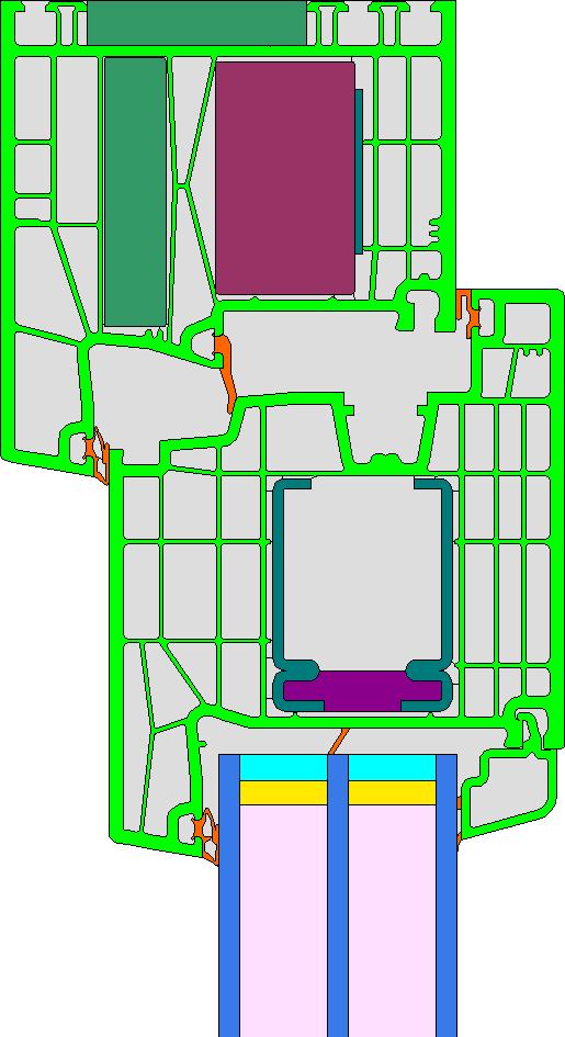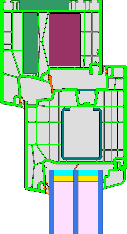 PVC frame with steel reinforcement and EPS insulation. The maximum size of the window with this reinforcement is 1,31 m x 2,60 m. Pane thickness 46 mm (4/17/4/17/4), rebate depth 20 mm. Spacer: SuperSpacer Premium with butyl secondary seal. There are no limitations on colour.