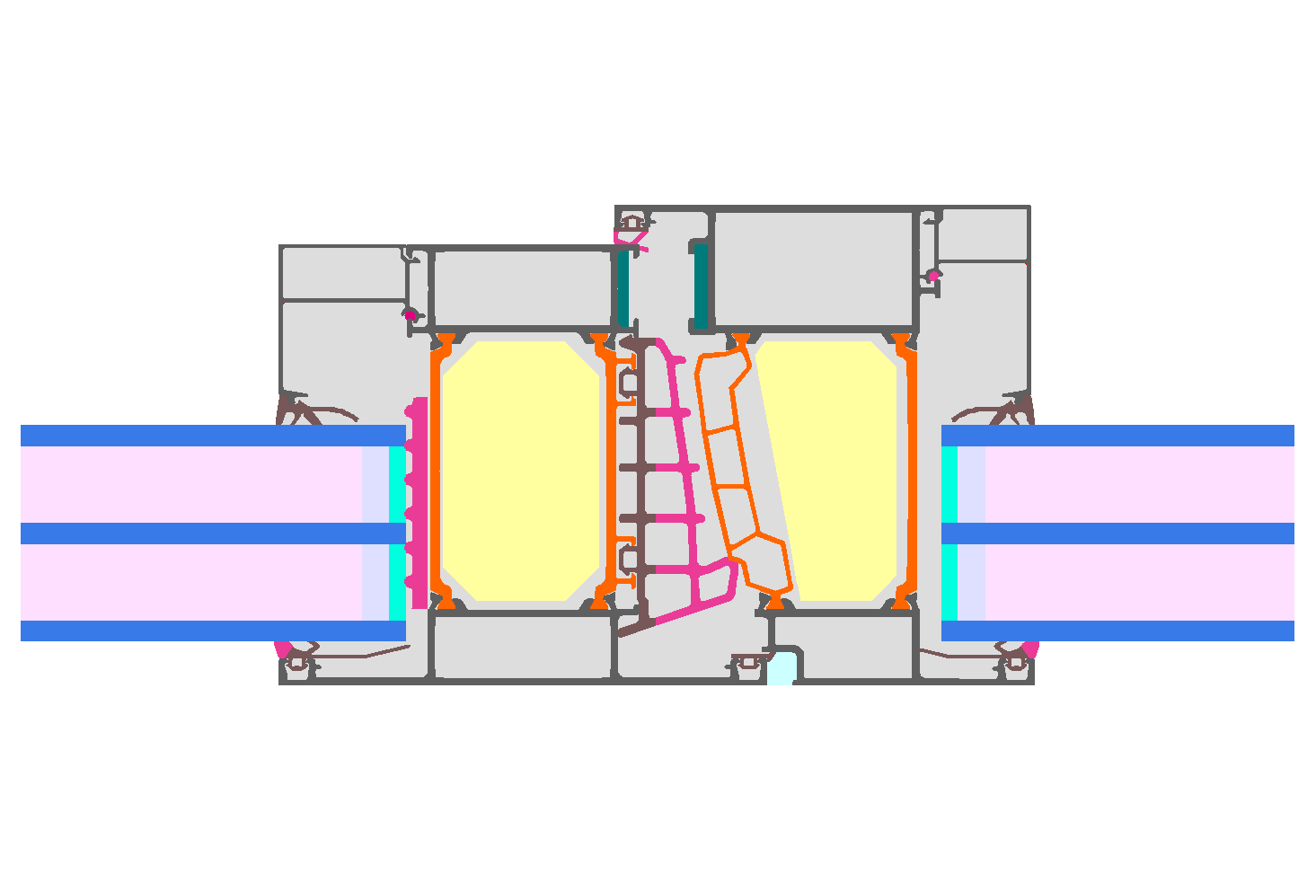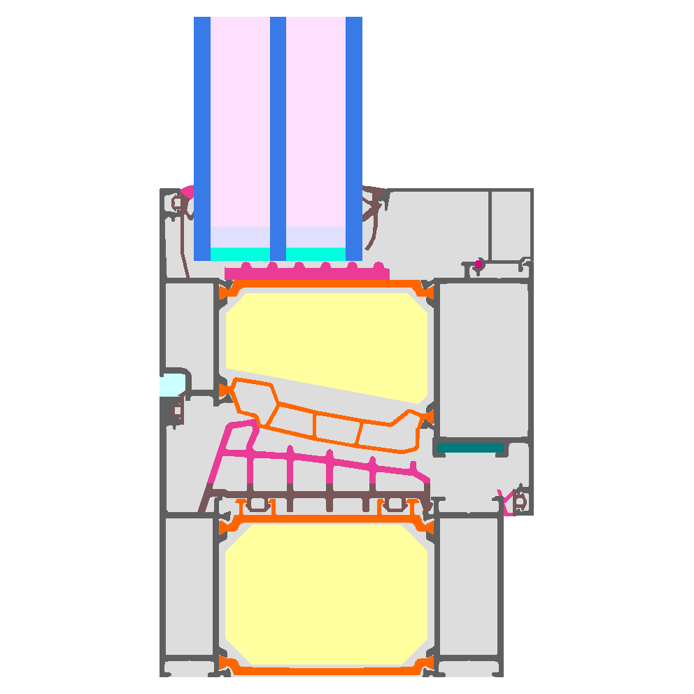 Aluminium frame with thermal separation (low lambda PA 0.21 W/(mK))and insulation (Kooltherm 0.022 W/(mK) ); Pane thickness: 51 mm (5/18/5/18/5); Rebate depth: 23 mm; Spacer: Technoform-Spacer SP16; Secondary sealing: Butyl