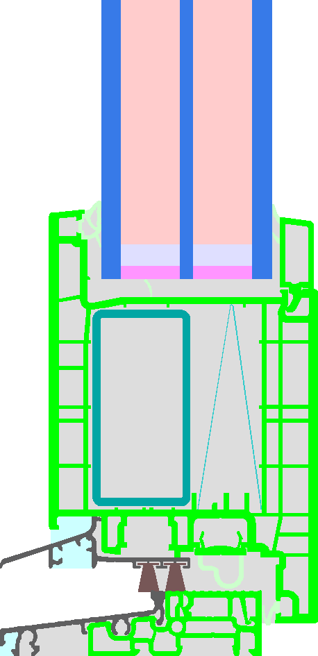 PVC frame with low emissivity bars (e = 5 %) for improving the thermal resistance; Steel reinforcement in the sash and at the lock side also in the blind frame; Maximum Sash dimensions with the chosen reinforcement: 1.05 m * 2.30 m. Pane thickness: 52 mm (6/18/4/18/6), rebate depth: 21 mm. Spacer: MULTITECH G.