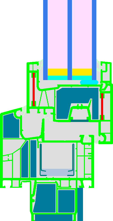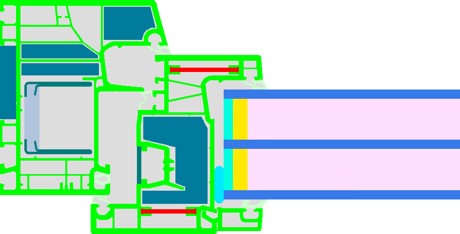 Vinyl window frame, insulated by EPS-foam 0.031 W/(mK)), reinforced by Polyamide with 50 % glassfibre (0.36 W/(mK)) and thermally broken steel reinforcement. With the tested combination, sash sizes of 1.15 m * 2.05 m and with coloured profiles 1.5 m * 1.6 m are possible. For larger elements, the aluplast GmbH processing guidelines must be followed. Pane thickness: 48 mm (4/18/4/18/4), rebate depth: 17 mm. Spacer: SuperSpacer Tri-Seal Premium with butyl as secondary seal.