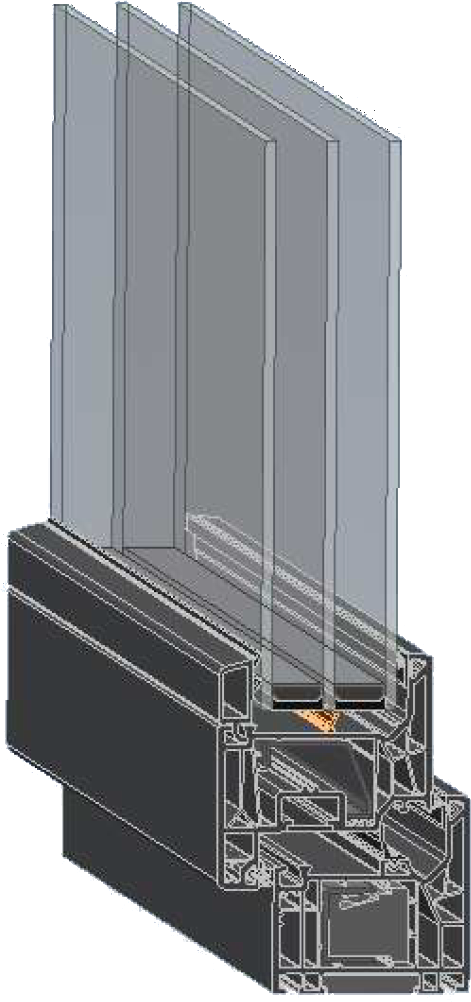 Vinyl frame with steel reinforcement in blind frame and sash; Frame insulated with modified Neopor (0.031 W/(mK)); Sash variants with (2) and without (1) dry bond glazing; Airtightness value of 0.14 m³/(h*m) ensured at a terrace door with flying mullion, 107 cm * 267 cm. Casement windows with sash sizes of 1.2 m * 1.35 m and with coloured profiles 1.2 m * 1.50 m are possible (for dry bond glazing: 1.2 m * 1.92 m and with coloured profiles 1.2 m * 1.83 m). For larger elements, the schueco processing guidelines must be followed. Pane thickness: 48 mm (4/18/4/18/4), rebate depth: OB 20 mm, FB 18 mm mm. Spacer: SWISSPACER Ultimate.