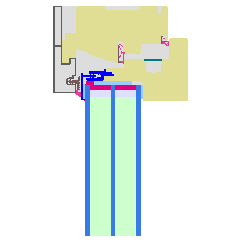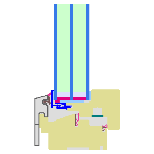 Timber frame (0.134 W/(mK)) with aluminium-facing shell with polyethylene foam insulation (0.038 W/(mK)) at the rebate. Pane thickness: 48 mm (4/18/4/18/4), rebate depth: 14 mm.