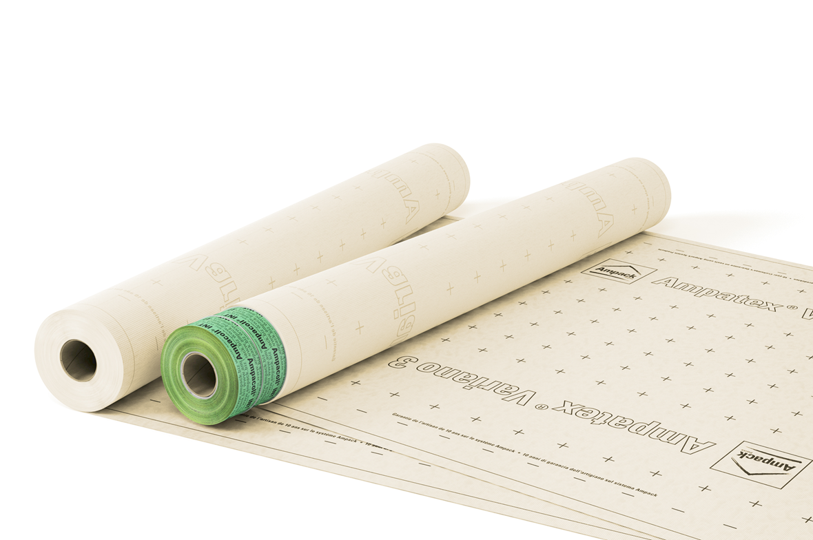 | System components | Airtight membrane „Ampatex Variano 3“ Self-adhesive Tape „Ampacoll INT“ Self-adhesive Tape „Ampacoll Fenax“ |
